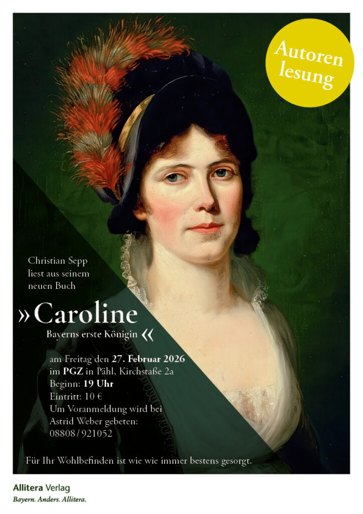 Zuletzt war ich im Dezember 2022 mit »Ludovika. Sisis Mutter und ihr Jahrhundert« zu Gast in Pähl. Und ich erinnere mich gerne an diesen schönen Abend mit einem sehr interessierten Publikum. Daher freue ich mich umso mehr, am Freitag den 27. Februar 2026 »Caroline. Bayerns erste Königin« im Pfarr- und Gemeindezentrum (PGZ) von Pähl vorstellen zu dürfen. Mein Dank gilt Astrid Weber, die mit großem persönlichen Engagement diesen Abend möglich macht. Beginn ist um 19 Uhr, der Eintritt beträgt 10€ und um eine Anmeldung bei Frau Weber wird gebeten unter der Telefonnummer 08808 / 921052. Die Biografie kann im Rahmen der Lesung auch käuflich erworben werden, auf Wunsch gerne signiert oder mit einer persönlichen Widmung.