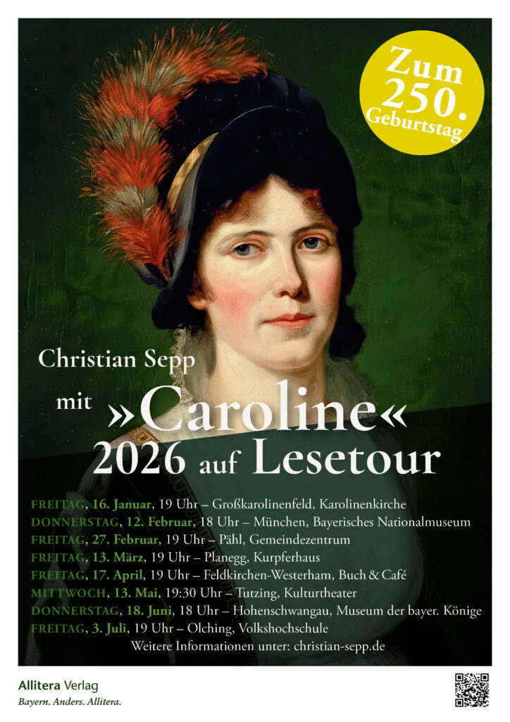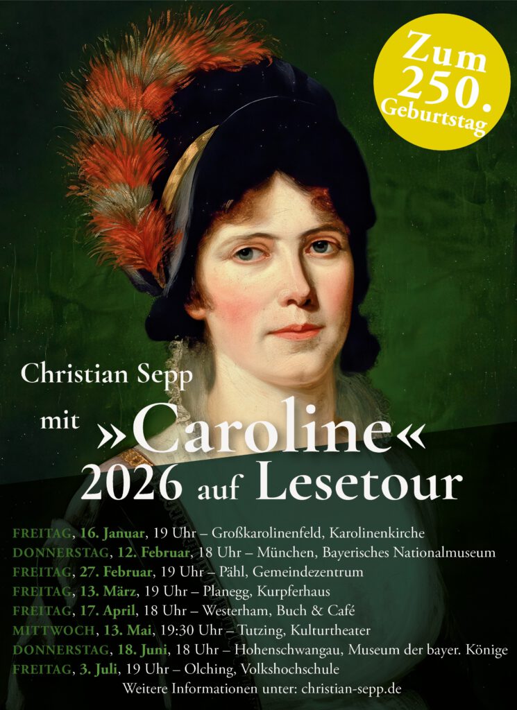 In diesem Jahr jährt sich der Geburtstag von Königin Caroline von Bayern zum 250. Mal. Als Prinzessin von Baden erblickte Caroline am 13. Juli 1776 in Karlsruhe das Licht der Welt, kurz nach ihrer Zwillingsschwester Amélie. Aus diesem Anlass bin ich mit der Biografie »Caroline. Bayerns erste Königin« 2026 in Bayern auf Lesetour unterwegs. Aktuell gibt es Termine bis zu den Sommerferien 2026, weitere Lesungen für den Herbst sind in Planung.